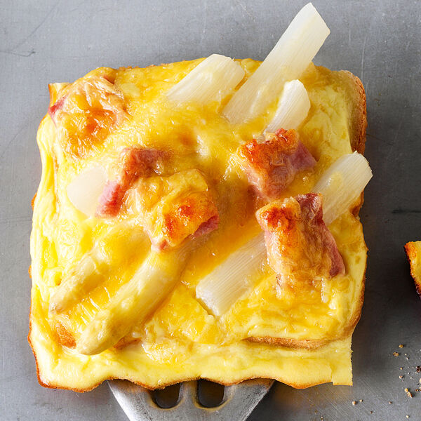 Die Auflaufform fetten und die Toastbrote hineinlegen. Den Spargel darauf verteilen und den Guss darübergießen. Die Tarte im Ofen (Mitte, Umluft 180°) ca. 20 Min. backen.