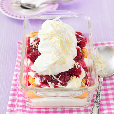 Lasagne für Süßschnäbel: Schichtspeise aus Löffelbiskuits, Himbeeren, Quarkcreme, Sahne und weißer Schokolade.