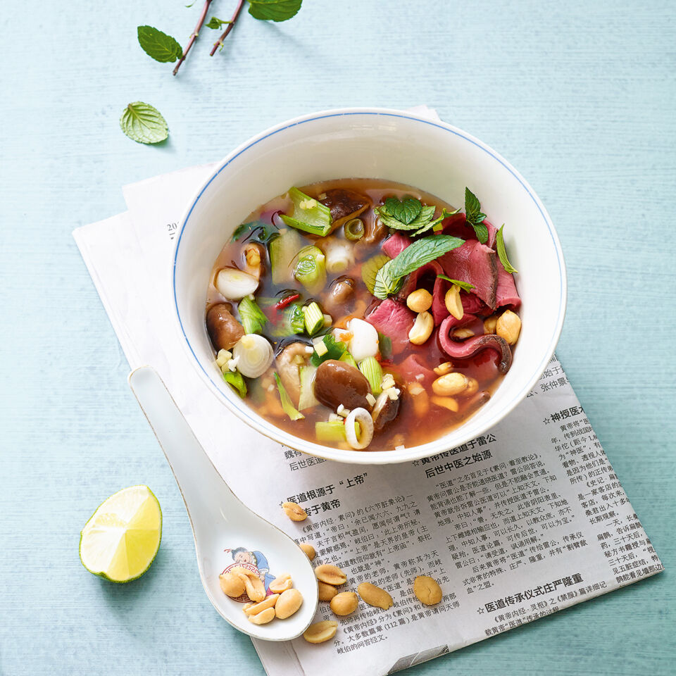 Roastbeef in dünne Streifen schneiden. Mit Minze und Erdnüssen auf Suppenschalen verteilen. Die Suppe darübergießen. Limette heiß waschen und abtrocknen, vierteln und zum Selberwürzen mit der Suppe anrichten.