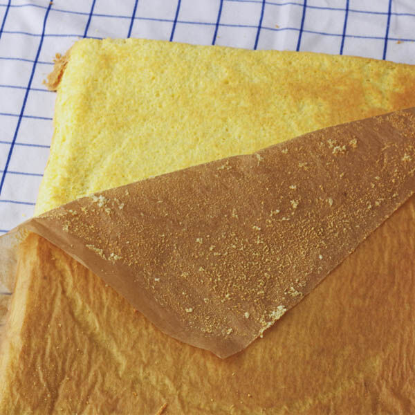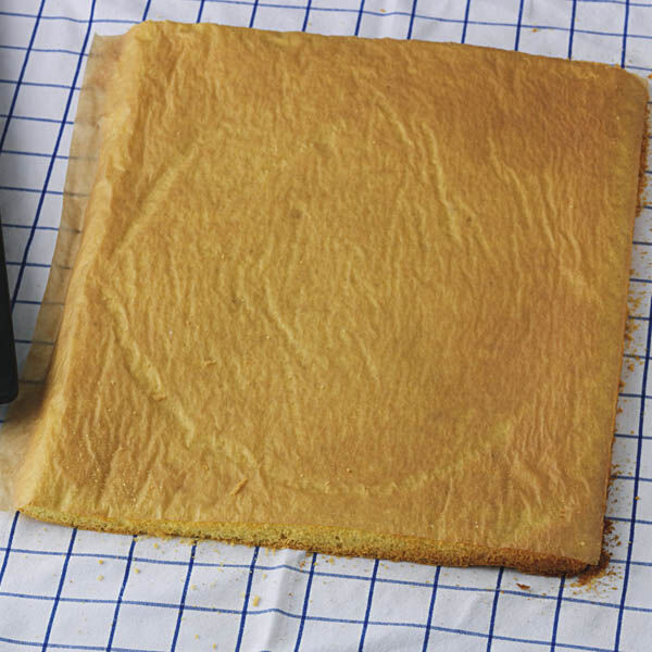 Inzwischen auf der Arbeitsfläche ein sauberes, feuchtes Geschirrtuch auslegen. Die Teigplatte zusammen mit der Dauerbackfolie oder dem Backpapier sofort nach dem Backen darauf stürzen.
