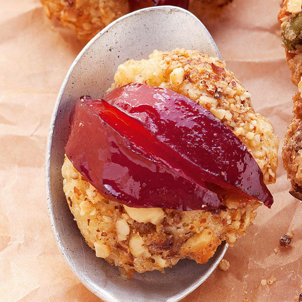 Zwetschgenkuchen im Mini-Format: Die nussigen Krapferln werden von in Zimt und Zwetschgengeist marinierten Zwetschgenspalten gekrönt.