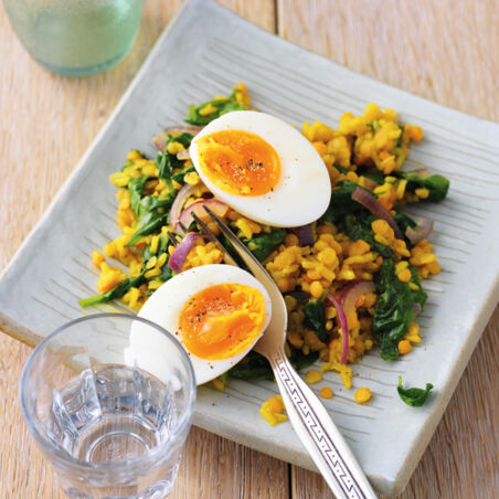 Ein appetitlich-bunter Sattmacher: Vollkornreis und rote Linsen sind ideale Begleiter zu Blattspinat und Ei. Chili und Kurkuma sorgen für Würze und Farbe.