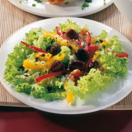 Den Lollo bianco zerpflücken, putzen, waschen und trockenschleudern. Die Blätter in mundgerechte Stücke zupfen und auf vier Teller verteilen. Die Paprikaschoten waschen, vierteln, von Stielansätzen, Kernen und inneren Trennwänden befreien und in dünne Streifen schneiden. Über den Salat verteilen.