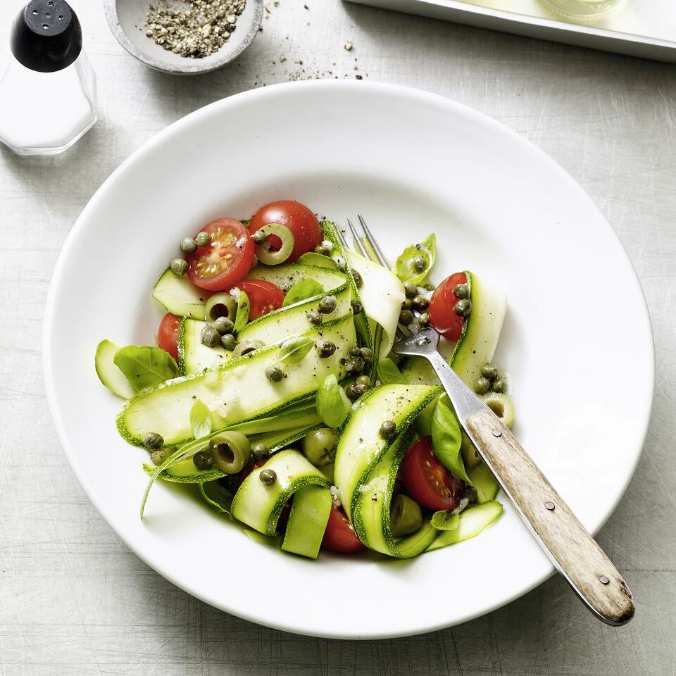 Zucchino, Tomaten, Basilikum und die Oliven mit dem Dressing vermischen. Salat kurz durchziehen lassen, dann locker auf zwei Teller häufen und servieren.