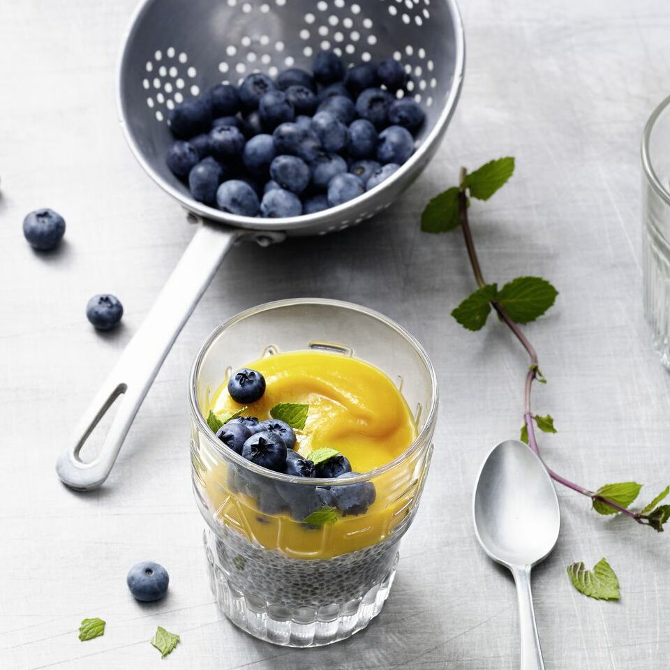 Gequollene Chia-Masse in zwei Gläser füllen und mit dem Apfelmark bedecken. Heidelbeeren darauf anrichten und mit der Minze bestreuen.