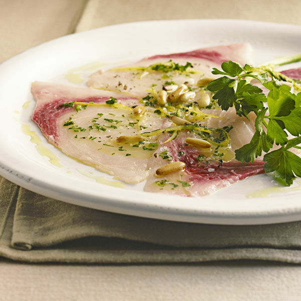 Schnelles Fisch-Carpaccio mit Pinienkernen
