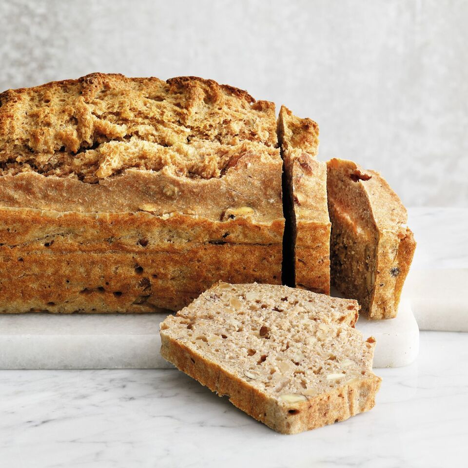 Den Teig sofort in die vorbereitete Form geben und im Ofen (Mitte) ca. 35 Min. backen. Das Brot noch ca. 5 Min. im ausgeschalteten Ofen lassen, dann herausnehmen. Mit einem Messer vom Formrand lösen, stürzen und auf einem Kuchengitter auskühlen lassen. Das Brot kann in Scheiben geschnitten eingefroren und bei Bedarf im Toaster schnell aufgebacken werden.
