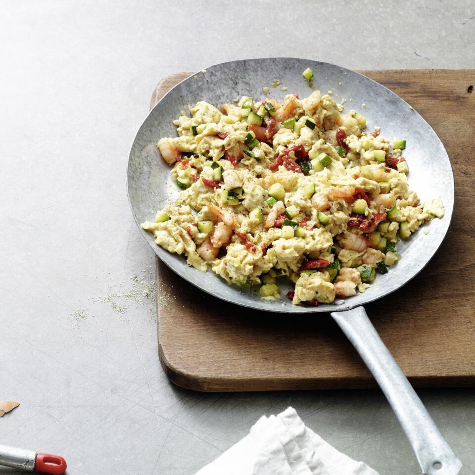 Schnelles Garnelenrührei mit Zucchini