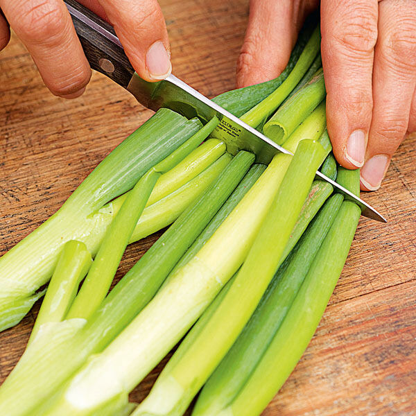 Von den Frühlingszwiebeln die Wurzelbüschel und die welken grünen Teile abschneiden. Die Zwiebeln waschen und in feine Ringe schneiden. Den Knoblauch schälen und in feine Scheiben schneiden. Tomaten abtropfen lassen und in feine Streifen schneiden.