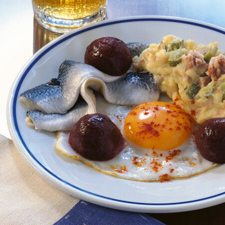 Die Eier in der restlichen Butter als Spiegeleier braten, mit Paprika würzen. Das Püree auf vier Teller verteilen und mit je 1 Bismarckhering, 1 Spiegelei und halbierten Rote-Beten-Kugeln anrichten.