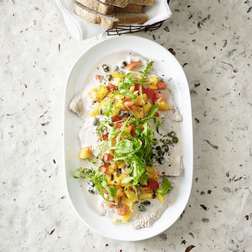 Die Schnitzelchen auf zwei Tellern oder einer Platte anrichten und mit der Thunfischcreme übergießen. Den Rucola und die Tomaten zu den Schnitzelchen geben, alles zusammen mit dem Brot servieren.