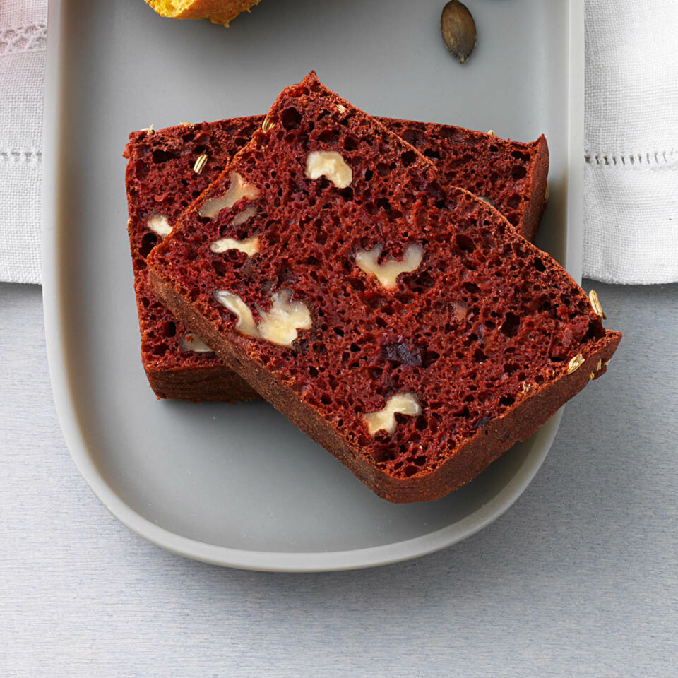 Rote Bete klein würfeln. Walnüsse längs halbieren. Backform einfetten und warm stellen. Mehl mit Backpulver und Trockenhefe mischen. Salz, Zucker und Ingwer mit Rote-Bete-Saft und Öl zum Mehl geben und den Teig kräftig schlagen.