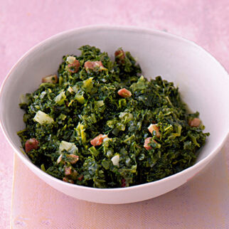 Etwa 5 Min. vor Garzeitende des Gratins die Schnitzel trockentupfen. Etwas Salz, Pfeffer und das restliche Öl verrühren. Das Fleisch damit einpinseln. Schnitzel in einer Grillpfanne je nach Dicke 2-3 Min. von jeder Seite goldbraun braten. Mit dem Grünkohlgratin servieren.