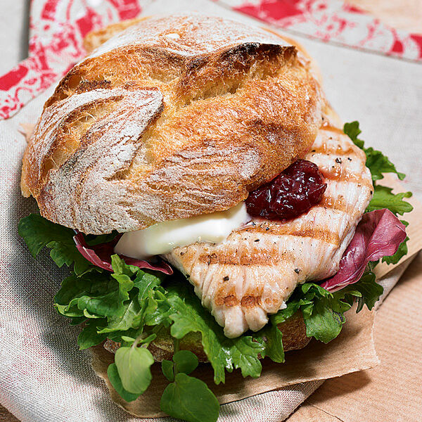 Das Baguettebrötchen aufschneiden. Mayonnaise mit Senf oder Preiselbeeren verrühren und beide Hälften damit bestreichen. Untere Hälfte mit Salat und Schnitzel belegen, die obere darauflegen.