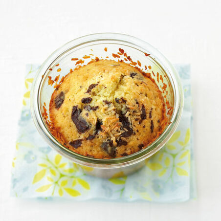 Schokolade klein hacken. Butter und Zucker schaumig rühren. Die Eier unterrühren, bis eine cremige Masse entsteht. Milch zugeben. Mehl und Backpulver mischen, mit den Kokosraspeln und Schokostückchen unterziehen.