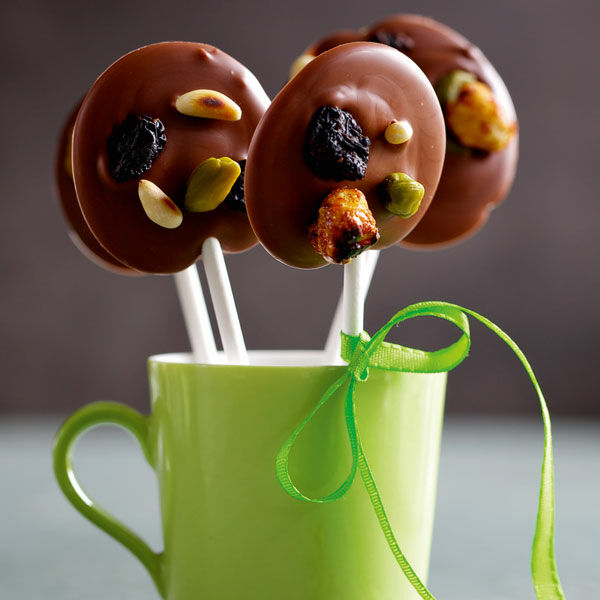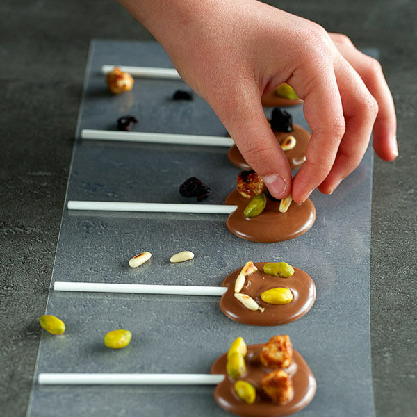 Die übrig gebliebene Kuvertüre wieder hacken, schmelzen und temperieren. Mithilfe des Spritzbeutels auf die Stielenden spritzen, sodass Lollies mit etwa 5 cm Durchmesser entstehen. Haselnüsse, Sauerkirschen, Pistazien und Pinienkerne dekorativ auf der Kuvertüre verteilen und etwas festdrücken. Die Lollis an einem kühlen Ort, jedoch nicht im Kühlschrank, ca. 2 Std. fest werden lassen.