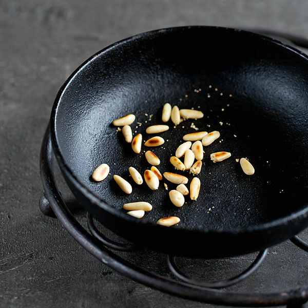 Die Pinienkerne in einer Pfanne ohne Fett vorsichtig goldbraun rösten, auf einen Teller geben und abkühlen lassen. Die getrockneten Kirschen halbieren.