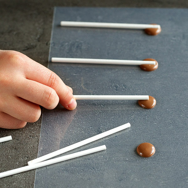 Die Kuvertüre hacken, auf dem Wasserbad schmelzen und temperieren. Kuvertüre in einen Einwegspritzbeutel geben (Spitze abschneiden) und 10 große Punkte von 1 cm Durchmesser mit je 10 cm Abstand voneinander auf Backpapier spritzen. Die Stielenden in die noch weichen Kuvertürepunkte drücken und fest werden lassen.