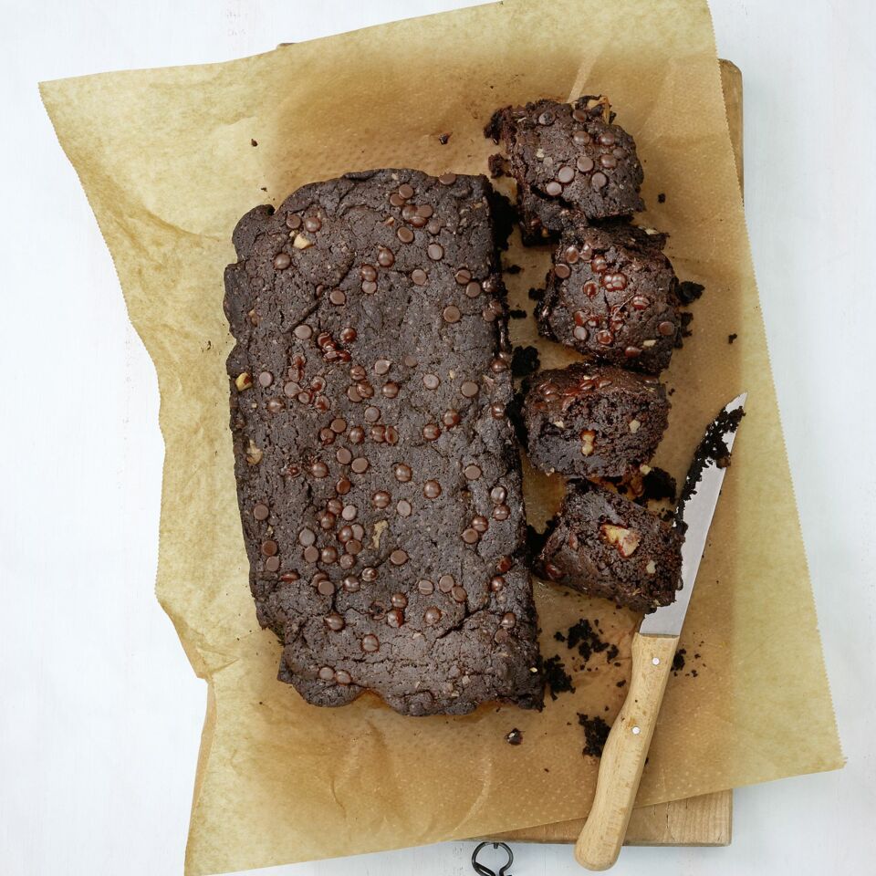 Den Backofen auf 180° vorheizen. Eine Auflaufform (25 x 19 cm) so mit Backpapier auslegen, dass es an den Rändern übersteht. Die Schokolade in Stücke brechen und in einer feuerfesten Schale wenige Minuten im Ofen schmelzen lassen. Die Walnüsse grob hacken.