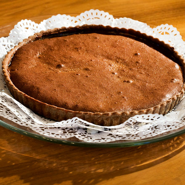 Die Form buttern. Für die Hülle Mehl mit Zucker, Vanillezucker und Kakao mischen. Auf einer bemehlten Arbeitsfläche mit der Butter in Flöckchen, Eigelben und Eiswasser zu einem glatten, geschmeidigen Teig kneten. Den Teig ausrollen, die Form damit auslegen. Dabei einen ca. 3 cm hohen Rand formen. Ein langes Stück Alufolie zusammendrehen und daraus einen Ring formen. Den Ring an den Teigrand pressen, so rutscht der Teig während des Backens nicht nach unten. Den Boden mehrfach mit einer Gabel einstechen. Mit Backpapier lose abdecken, für 1 Std. in den Kühlschrank stellen.