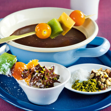 Bei Tisch die Fruchtspieße in die heiße Schokolade tauchen. Mit Pistazien, Haselnüssen oder Kokosflocken bestreuen und genießen.