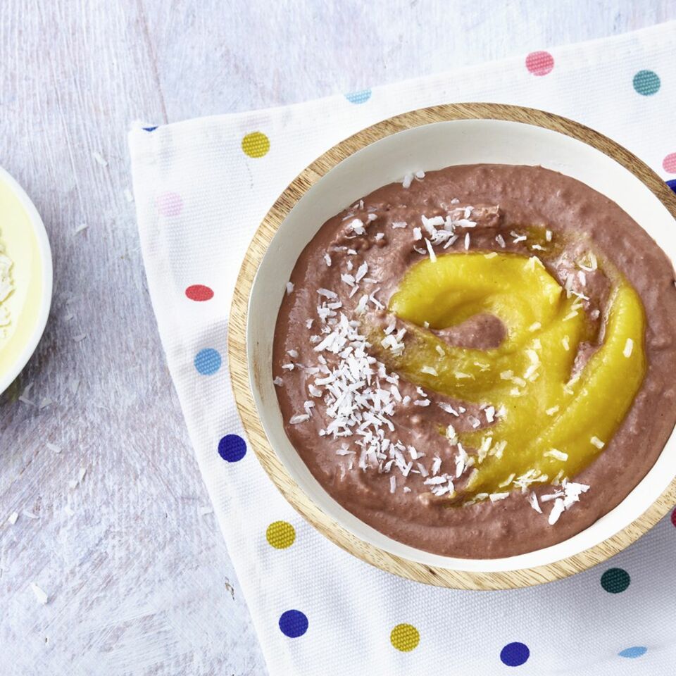 Den Brei vor dem Anreichen auf Handwärme abkühlen lassen, dann mit den Kokosflocken bestreuen und mit dem Apfel-Mango-Mark toppen.