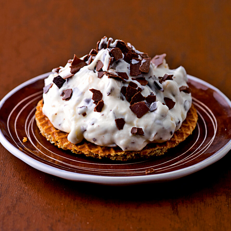 Die Creme auf den Honigwaffeln verteilen. Dann mit den Schokoraspeln bestreuen und die Törtchen sofort servieren.