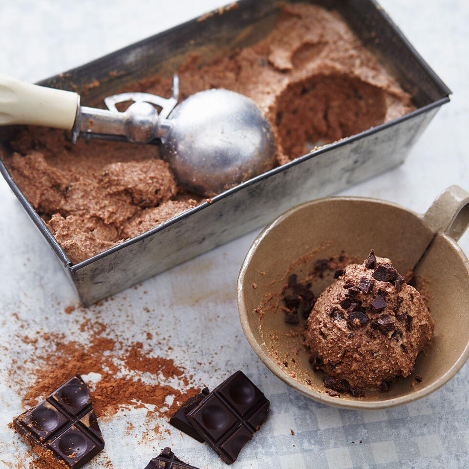 Die Masse in einer Schüssel ca. 4 Std. ins Tiefkühlfach stellen. Sobald die Masse beginnt fest zu werden, häufiger umrühren. Oder die Masse in einer Eismaschine in ca. 30 Min. gefrieren lassen. Kurz bevor das Eis fertig ist, Rohschokolade grob hacken und unterrühren.
