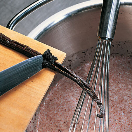 ⅛ l Milch abnehmen und mit der Speisestärke verrühren, die übrige Milch in einen Topf gießen. Die Schokolade reingeben, Vanilleschote längs aufschlitzen, das Mark rausschaben und mit der Schote in den Milchtopf geben. Bei mittlerer Hitze alles unter Rühren aufkochen.