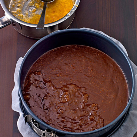 Die Kekse in einen Gefrierbeutel geben und mit dem Nudelholz fein zerbröseln. Den Boden der Form mit Backpapier auslegen und mit dem Formrand umschließen. Die Butter zerlassen, mit den Keksen gut vermischen und auf den Boden der Form drücken. Die Konfitüre in einem kleinen Topf bei kleiner Hitze erwärmen. Den Boden damit bestreichen und abgedeckt kalt stellen.