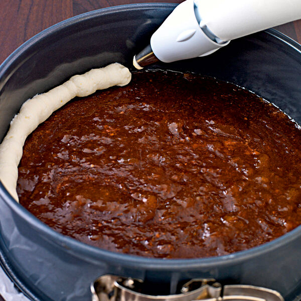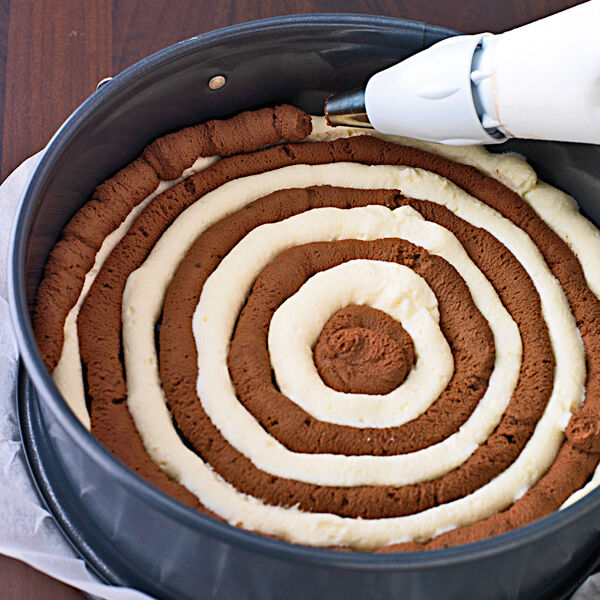 Die helle und dunkle Creme getrennt in einen Spritzbeutel mit Lochtülle füllen und in 2 Schichten auf den Boden spritzen. Zuerst helle und dunkle Creme im Wechsel von außen nach innen dicht an dicht kreisförmig auf den Boden spritzen.