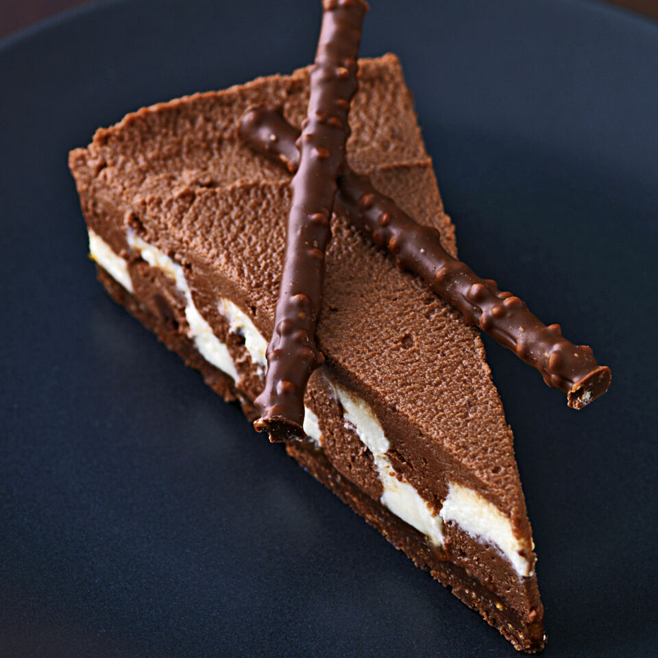 Bei der zweiten Schicht zuerst die dunkle Creme, dann die helle Creme kreisförmig aufspritzen, so dass man beim Anschneiden ein Schachbrettmuster sieht. Die übrige dunkle Creme auf der Oberfläche verteilen und glatt streichen. Die Torte abgedeckt 3 Std. kalt stellen. Die Torte zum Servieren aus der Form lösen und mit Schokoladensticks garnieren.