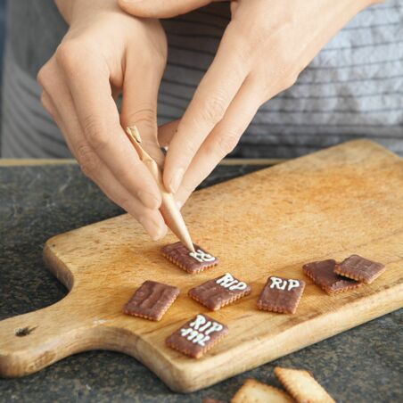 Für die Deko beide Schokoladen hacken, getrennt im heißen Wasserbad schmelzen und abkühlen lassen. Die geschmolzenen Schokoladen in die Spritztüten füllen und jeweils eine kleine Ecke abschneiden. Den Geistern dunkle Schoko-Gesichter und den Keksen weiße Jahreszahlen als Grabsteine aufmalen.