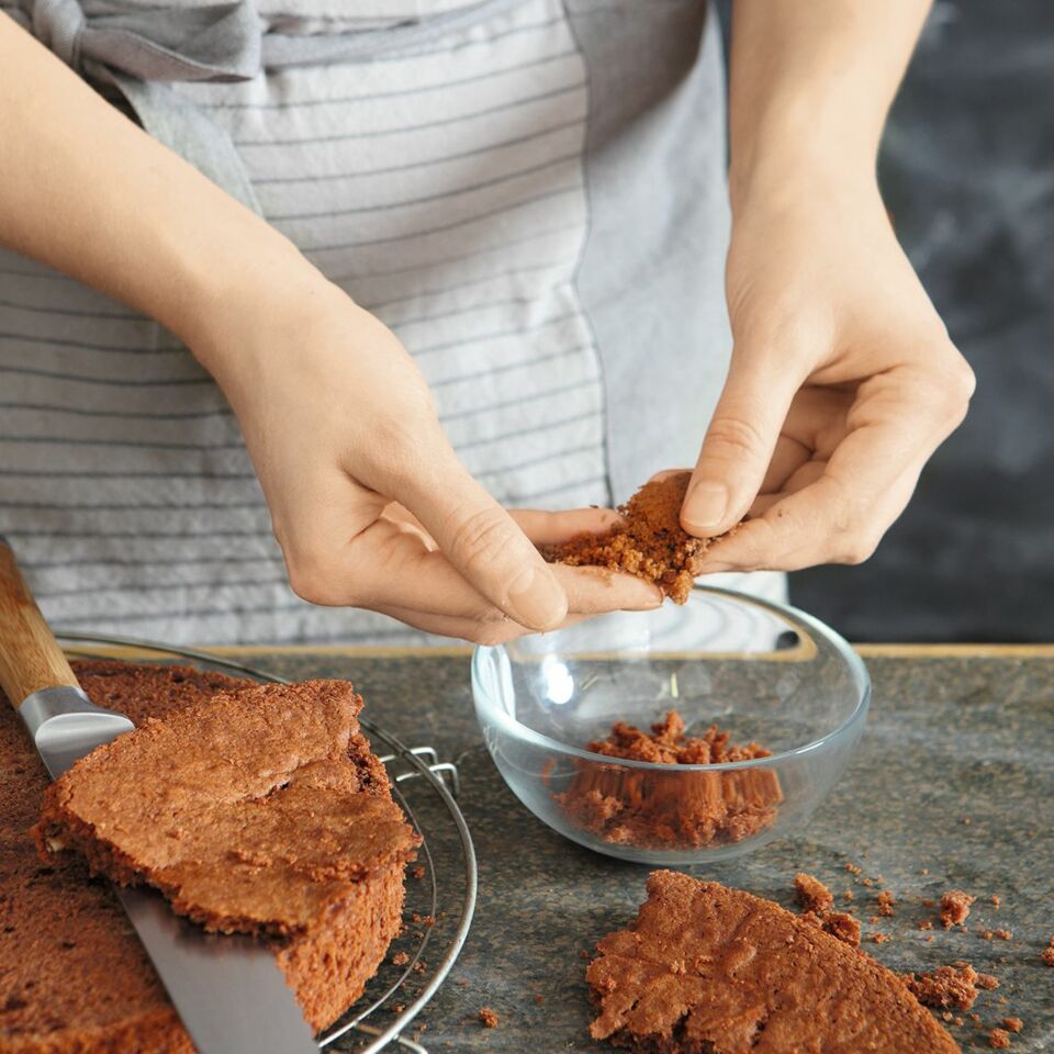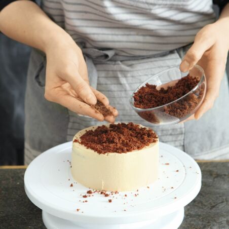 Die Kuchen begradigen und waagerecht halbieren. Die abgeschnittenen Teile fein zerbröseln. Einen großen Boden auf das Cake Board setzen und mit 3 EL Buttercreme bestreichen. Den zweiten großen Boden daraufsetzen, die Torte rundum mit Buttercreme einstreichen und 1 Std. kalt stellen. Mit den kleinen Böden ebenso verfahren. Die kleine Torte rundum mit den Kuchenbröseln bedecken und diese leicht in die Buttercreme drücken. Die Keksgrabsteine darauf platzieren und die Torte ebenfalls 1 Std. kalt stellen.