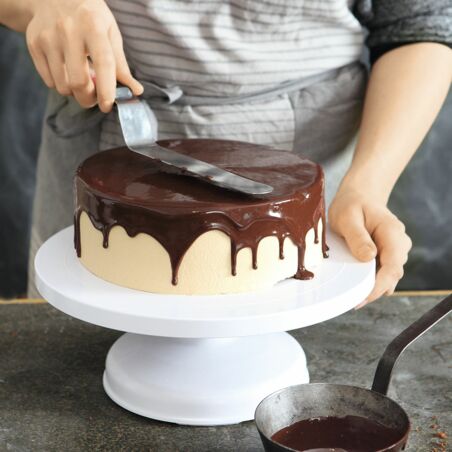 Die Kuvertüre grob hacken und in einer Schüssel über dem heißen Wasserbad schmelzen. Danach leicht abkühlen lassen. Die große Torte auf eine Tortenplatte setzen und mit der Kuvertüre übergießen, sodass am Rand kleine Schokoladennasen entstehen. Die Kuvertüre etwas abkühlen lassen, dann die kleine Torte mittig daraufsetzen und die Baiser-Geister rundum auf den Rand der großen Torte setzen.
