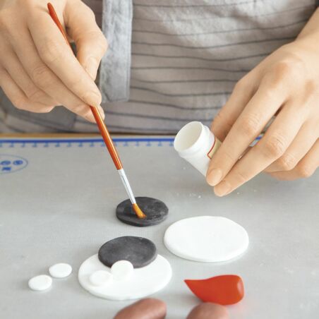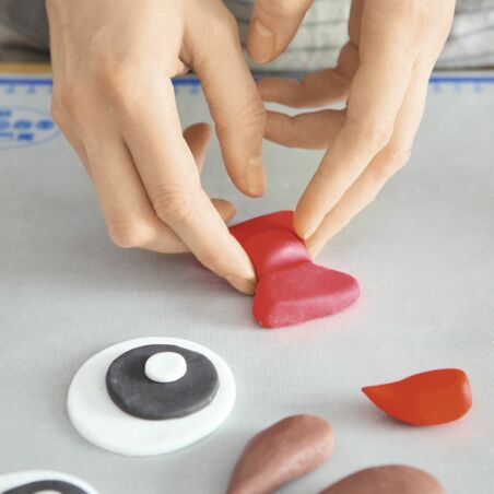 Aus dem restlichen weißen Fondant zwei große (8 cm Ø) und zwei kleine Kreise (2 cm Ø) ausstechen. Den übrigen weißen Fondant rot, orange und schwarz einfärben. Aus dem schwarzen Fondant zwei Kreise (5 cm Ø) ausstechen. Aus dem roten Fondant eine Schleife, aus dem orangefarbenen Fondant den Schnabel und aus den braunen Fondantresten zwei Ohren formen.