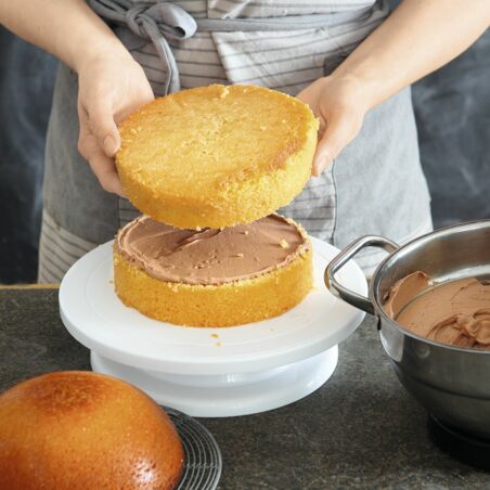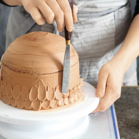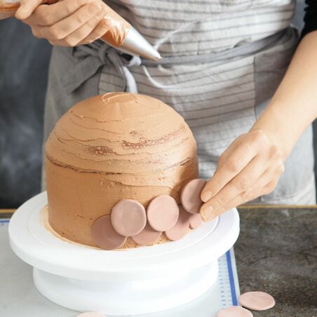 Die Kuchen begradigen, einen runden Kuchen auf das Cake Board setzen und mit 2 EL Buttercreme bestreichen. Den zweiten runden Kuchen aufsetzen, ebenfalls mit 2 EL Buttercreme bestreichen und den halbkugelförmigen Boden auflegen. Die Torte rundum dünn mit Buttercreme einstreichen und 1 Std. kalt stellen. Die restliche Creme in den Spritzbeutel füllen.