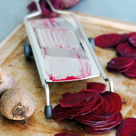 Für die Dekoration den Backofen auf 170° (Umluft; hier empfehlenswert) vorheizen. Drei Backbleche mit Backpapier auslegen. Die Rote-Bete-Knollen waschen, putzen und schälen. Mit dem Gemüsehobel in feine Scheiben schneiden.