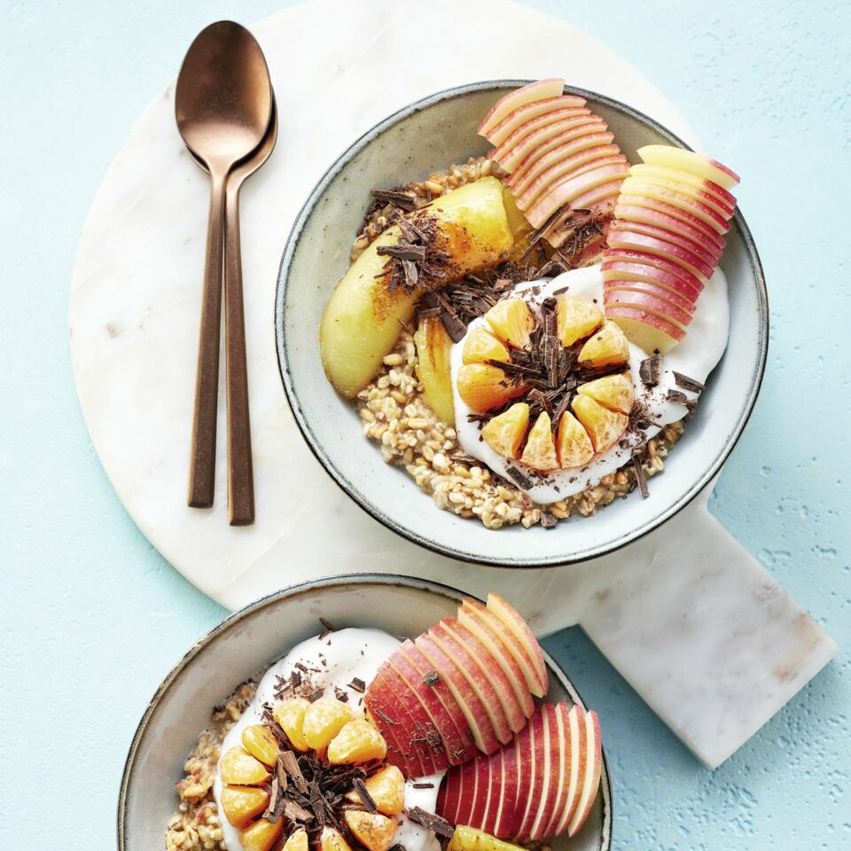 Je zwei Bananenhälften in die Bowls geben und mit den Mandarinen, Apfelscheiben und Schokoraspeln garnieren.