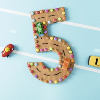 Den anderen Kuchen halbieren. Eine Hälfte bündig zur oberen Schnittkante am anderen Kuchen anlegen, sodass sich eine Drei ergibt.