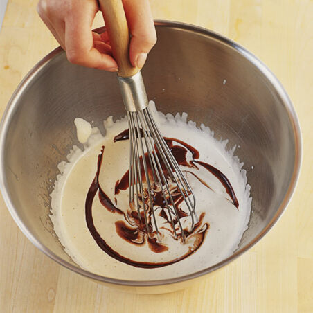 Die Creme in einer Küchenmaschine ca. 20 Min. kalt schlagen. Die lauwarme Schokolade unterziehen und etwas abkühlen lassen. Die Sahne unterheben.