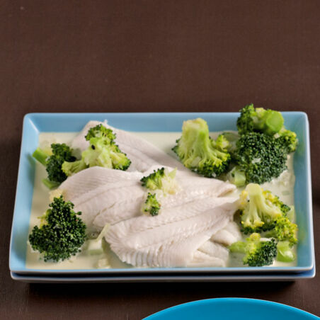 Die Schollenfilets salzen und pfeffern und mit Zitronensaft beträufeln. Den Fisch vorsichtig auf das Brokkoligemüse legen und bei geschlossenem Deckel 5-10 Min. (je nach Dicke der Fischfilets) garen.