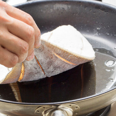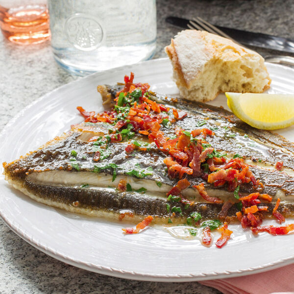 Auf dieselbe Weise kann man auch alle anderen Plattfische braten – entweder im Ganzen oder bei größeren Exemplaren in Stücken. Bei Babysteinbutt, Steinbutt, Glattbutt oder Heilbutt ändert sich fast nichts bei der Zubereitung. Nur wenn die Stücke sehr dick sind, die Garzeit ein wenig erhöhen und bei mittlerer Hitze braten. Seezungen müssen vor dem Braten gehäutet werden, das übernimmt gerne der Fischhändler. Und falls Sie kein besonderer Freund der Flossensäume sind, lassen Sie die auch gleich mit abschneiden.