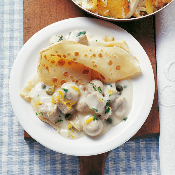 Den Deckel vom Kalbsragout abnehmen und die Sauce bei etwas stärkerer Hitze noch ein wenig einkochen lassen. Mit Zitronenschale und den Kapern würzen, abschmecken und auf die Pfannkuchen verteilen.