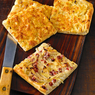 Inzwischen die Zwiebeln schälen und würfeln. Den Speck fein würfeln. Öl erhitzen, Speck und Zwiebeln darin bei mittlerer Hitze 5 Min. anbraten. Den Backofen auf 180° vorheizen.