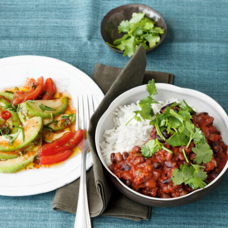 Das Koriandergrün abbrausen und trocken tupfen, die Blättchen und die zarten Stiele hacken und über die Bohnen streuen. Die Bohnen mit Reis oder als Tortilla-Wraps servieren.