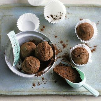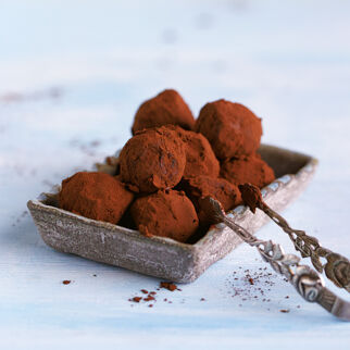 Zum Überziehen 250 g Kuvertüre hacken, schmelzen und auf 31 - 32° temperiereN. Die restliche Kuvertüre sehr fein hacken und in eine Schüssel geben. Die Trüffel in einer Handfläche mit der temperierten Kuvertüre überziehen, dann in der fein gehackten Kuvertüre wälzen und auf Backpapier ca. 2 Std. fest werden lassen.