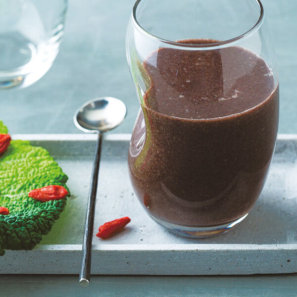 Den Smoothie in Gläser füllen und mit Gojibeeren garnieren. Beides frisch servieren und genießen.