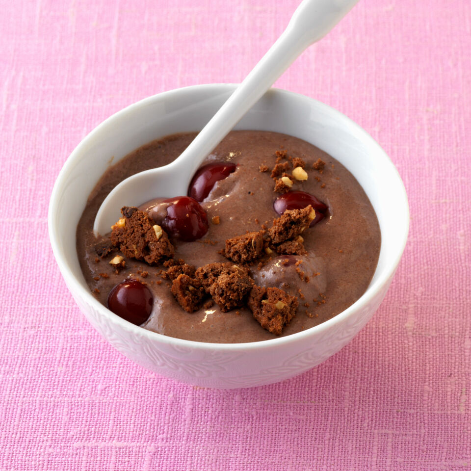 Die gesunde Alternative zur Schwarzwälder Kirschtorte heißt Schwarzwälder Grießbrei. Die Sahne lassen wir weg, dafür krümeln wir einen Schokokeks als Knusper-Topping über den Grießbrei mit Schattenmorellen.