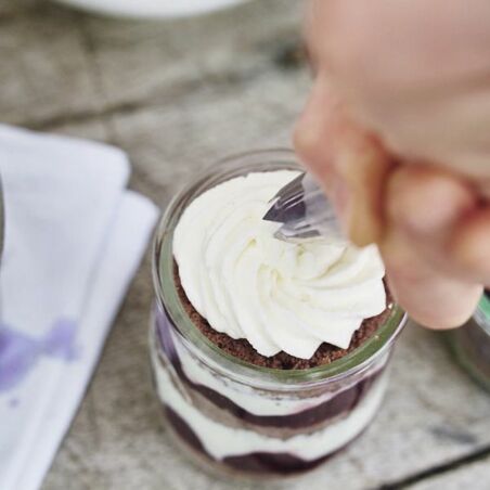 Nun in jedes Glas 1 Biskuitplatte als Boden legen und mit 1 - 2 TL Espresso beträufeln, damit der Biskuit schön saftig bleibt. Darauf ein paar Kirschen verteilen und mit der Mascarponecreme toppen. In dieser Reihenfolge noch zwei weitere Schichten aus Biskuitplatten, Espresso, Kirschen und Creme in die Gläser füllen. Am Ende die Sahne steif schlagen und damit sowie mit den Schokoraspeln die Schwarzwälder-Kirsch-Gläser garnieren.